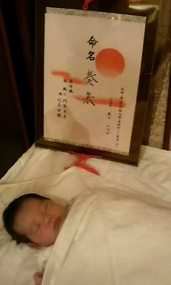 治療と予防 予防法は、帰宅後うがいや手洗いをする、マスクをつける、人混みを避けるなど、通常のインフルエンザと同じです。しかし、この場合ヒトは全く抗体を持っていませんのでワクチンを接種する必要があります。現在のワクチンは新型インフルエンザには効きませんが、新型インフルエンザに効くワクチンを早期に実用化するために、世界中で研究が行われています。新型インフルエンザの治療には、抗インフルエンザ薬(ノイラミニダーゼ阻害薬)が有効であると考えられています。このため、国や一部の自治体では、新型ウイルスの出現に備えて、抗インフルエンザ薬の備蓄を行っています。 5月17日(日)、道後山の手ホテルにて、命名披露会、名づけを行った。赤ちゃんの名前は、法的には、出生届を誕生から二週間以内に決めればいいのだが、「お七夜」という祝いの席で命名が披露されるのがしきたりである。大変忙しいところ、奏来の為に両親、姉たちが駆け付けてくれて、命名披露会が開催することができた。 「乾杯!」、私の乾杯の発声で命名披露会は始まった。美味しい食事とお酒を頂きながら、出産状況や懐かし話などで大いに盛り上がった。アルコールも大分摂取し、次第に皆の声のトーンが上がってきた。そんな状況でもただ一人、すやすや眠っていた奏来がいた。妻も不思議そうに首を傾げている。「いつもならこの時間帯は大泣きやのにね~」と・・・。おかげ様で滞りなく命名披露会を行うことができました。 本日は大変お忙しいところ、奏来の為に集まっていただきまして、誠にありがとうございました。夫婦共々まだまだ未熟で、迷惑をお掛けすることもありますが、ご指導、ご鞭撻のほどよろしくお願い致します。大きな心を持って奏来を育てていきたいと思います。 てるひこ 「命名書」には正式と略式があります。正式な「命名書」は横長の奉書紙を使います。奉書紙を左、右の順に三つ折りにして、表に「命名」と濃い墨で筆書きします。三つ折りの奉書紙を開いて、右肩に父親の名前と続柄を書き、中央部分に大きく名前を墨書し、左下に生年月日をやや小さく記します。三つ折りの左部分には、右肩に年月日、左下に父母の名前を並べて記します。 略式の「命名書」は、半紙を使います。中央の上に「命名」と記し、その下に大きく名前を墨書して、名前の左側に生年月日を加えます。 落ち着いた洋個室でお食事をさせていただきました。いつもは洋食を食べない父も「これは美味い」と食べていました。そして山の手ホテルさんには奏来の為にベビーベットまで用意していただきました。ありがとうございました。 本日、5月17日(日)は石丸さんの誕生日であります。おめでとうございます。いつも妥協を許さない石丸さんのその姿は、みんな信頼を置いています。いつも現場ご苦労様です。今日は特別な日であります。そして日曜日であります。ゆっくりと家族とお過ごし下さい。本日は誠におめでとうございました。