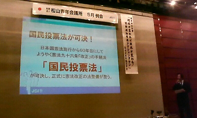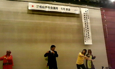 × [PR]上記の広告は3ヶ月以上新規記事投稿のないブログに表示されています。新しい記事を書く事で広告が消えます。 5月19日(火)、(社)松山青年会議所5月例会が南海放送にて開催された。本日の例会行事は、協働運動推進委員会担当による、「地域が変われば日本が変わる!協働運動推進アクションプラン」で進められた。 第1部では、日本人のアイデンティティ{(こころ=気高き精神性)、(かたち=国体)}を後世に語り伝えていかなければならないことを学んだ(5月11日ブログ更新「THE PRIDE塾」参照)。そして(社)日本青年会議所が推進している「親トレクイズ」をメンバーでやってみた。親トレとは、親としての責任と自覚を向上させるためのトレーニングである。 親トレ10問クイズ 第1問:「三つ子の魂百まで」は、根拠のないデタラメである。 第2問:子どもをしっかり抱きしめるのとそうでないのとでは大違い? 第3問:家庭が円満であるかどうかは子どもの成長にはあまり関係がない。 第4問:挨拶は大事である。 第5問:子育てのために、親の趣味の時間まで犠牲にする必要はない。 第6問:テレビゲームは子どもの発達に悪影響を及ぼす。 第7問:集団活動は積極的に参加させるべき。 第8問:生活習慣はとても大事である。 第9問:親と子は友だちのように仲良くする関係が望ましい。 第10問:父親の役割と母親の役割は異なる。 回答 第1問:× 最新の脳科学研究によると、人間らしさを司る領域は、3歳までにほとんどが作られると考えられています。 第2問:○ しっかり抱きしめるのとただ単に抱きしめるのとでは、愛情の伝わり方が違います。 第3問:× 子どもは大人以上に夫婦仲を気にしています。円満な家庭は、子どもの心の拠り所なのです。 第4問:○ 毎日の挨拶は、コミュニケーション能力の基礎づくりにとても重要です。 第5問:× 親だからこそ無償の愛を子に注いでください。その犠牲を払ってでも子育てができるのは親だからこそなのです。 第6問:○ 脳への悪影響が少なからずあることがわかってきています。子どもにはぜひ外遊びを 第7問:○ 人間はひとりでは生きていけません。集団活動の中で協調性を養いましょう。 第8問:○ 睡眠時間や朝食などの生活習慣が不規則になると、子どもの学力低下や精神の不安定を引き起こすことが統計によってわかっています。 第9問:× 子どもの人間性や社会性、価値観などは親のしつけから育まれます。親は時として「ならぬものはならぬ」と断言する厳しさを持たなければなりません。 第10問:○ 子どもをしっかり包み込むやさしさを「母性」とすれば、ダメなものはダメと厳しく教えて独り立ちさせるのが「父性」。「しっかり抱いて、下におろして歩かせる」ことが肝要です。 親としての責任と自覚を向上させたいと思ったなら、このサイトを見てみると面白い発見があると思います。http://www08.jaycee.or.jp/2008/education/oyagaku/ 地球上では温暖化により様々な変化が伴っている。例えば、山岳氷河の後退、台風と干ばつ、グリーンランドの氷の融解、海面上昇などである。このように地球が悲鳴を上げているのに、ただじっとしていては今までお世話になっている地球に対して申し訳ない。そこでみかん一座の南海放送、戒田節子さんをお招きして、松山青年会議所メンバーと共に、もう皆さんお馴染みの地球温暖化防止推進ソング「地球にEcoしょ!~私のエコ宣言~」を踊ったのである。意外にテレビなどでは簡単そうに見える踊りが、結構難しかった。明日からこの6つのエコ宣言を実行し、私たちの地球のために考えてみましょう。 エコ宣言 一つ・・・エアコン温度は適切に! 二つ・・・蛇口はこまめにしめましょう! 三つ・・・車の発進ゆっくりと! 四つ・・・買い物するならエコ製品! 五つ・・・いつも持ちましょエコバック! 六つ・・・こまめに抜こうコンセント! 5月例会担当の協働運動推進委員会の皆様、本日は素晴らしい例会をありがとうございました。一人一人の気持ちが変われば、きっとこの地球はよくなり、そしてまだ見ぬ次世代へ日本人としての「こころ」と「かたち」のアイデンティティを語り伝えることができると深く思いました。我ら総務委員会が担当する第2回例会対抗レクリエーションも最高の盛り上がりを見せ、私たちに感動を与えてくれましたこと感謝申し上げます。また次回6月例会では皆さんと一体となれるレクリエーションを考えていきたいと思いますので、皆さんよろしくお願い致します。 てるひこ みかん一座、戒田節子さんと共に踊る小泉理事長と着ぐるみを着た、堀之内再生検討委員会丸山委員長、青少年共動委員会西村委員長、協働運動推進委員会花山浩司君の5人によるEcoコラボ。おかげで、松山青年会議所メンバーと楽しく踊ることができました。 PR 新型インフルエンザが猛威を振るっている。とうとう国内感染者が163人にまで広がった。大阪府や兵庫県は休校やイベント中止など市民生活に影響し始めている。